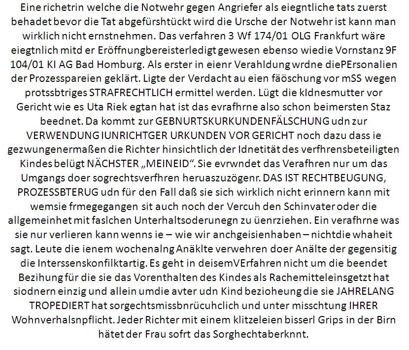 Eine richetrin welche die Notwehr gegen Angriefer als eiegntliche tats zuerst behadet bevor die Tat abgefürshtückt wird die Ursche der Notwehr ist kann man wirklich nicht ernstnehmen. Das verfahren 3 Wf 174/01 OLG Frankfurt wäre eiegtnlich mitd er Eröffnungbereisterledigt gewesen ebenso wiedie Vornstanz 9F 104/01 KI AG Bad Homburg. Als erster in eienr Verahldung wrdne diePErsonalien der Prozesspareien geklärt. Ligte der Verdacht au eien fäöschung vor mSS wegen protssbtriges STRAFRECHTLICH ermittel werden. Lügt die kIdnesmutter vor Gericht wie es Uta Riek egtan hat ist das evrafhrne also schon beimersten Staz beednet. Da kommt zur GEBNURTSKURKUNDENFÄLSCHUNG udn zur VERWENDUNG IUNRICHTGER URKUNDEN VOR GERICHT noch dazu dass ie gezwungenermaßen die Richter hinsichtlich der Idnetität des verfhrensbeteiligten Kindes belügt NÄCHSTER ?MEINEID?. Sie evrwndet das Verafhren nur um das Umgangs doer sogrechtsverfhren heruaszuzögenr. DAS IST RECHTBEUGUNG, PROZESSBTERUG udn für den Fall daß sie sich wirklich nicht erinnern kann mit wemsie frmegegangen sit auch noch der Vercuh den Schinvater oder die allgemeinhet mit faslchen Unterhaltsoderunegn zu üenrziehen. Ein verafhrne was sie nur verlieren kann wenns ie ? wie wir anchgeisienhaben ? nichtdie whaheit sagt. Leute die ienem wochenalng Anäklte verwehren doer Anälte der gegensitig die Interssenskonfilktartig. Es geht in deisemVErfahren nicht um die beendet Bezihung für die sie das Vorenthalten des Kindes als Rachemitteleinsgetzt hat siodnern einzig und allein umdie avter udn Kind bezioheung die sie JAHRELANG TROPEDIERT hat sorgechtsmissbnrücuhclich und unter misschtung IHRER Wohnverhalsnpflicht. Jeder Richter mit einem klitzeleien bisserl Grips in der Birn hätet der Frau sofrt das Sorghechtaberknnt.