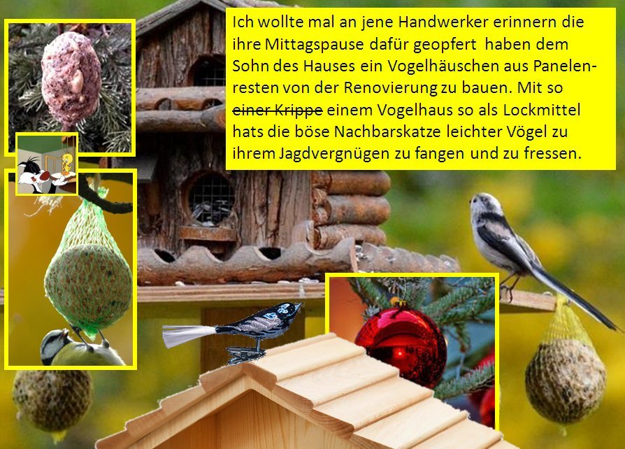 Ich wollte nur mal an jene Handwerker erinnern die ireMittagspause dafür geopfert haben dem Sohn des Hauses ein Vogelhäsuchen aus Panelenresten von der Renovierung zu bauen. Mit so eienr Krippe einem Vogelhaus so als Lockmittel hats die böse Nachbarskatze leichter Vögel zu ihre Jagdvegnügen zu fangen und zu fressen.
