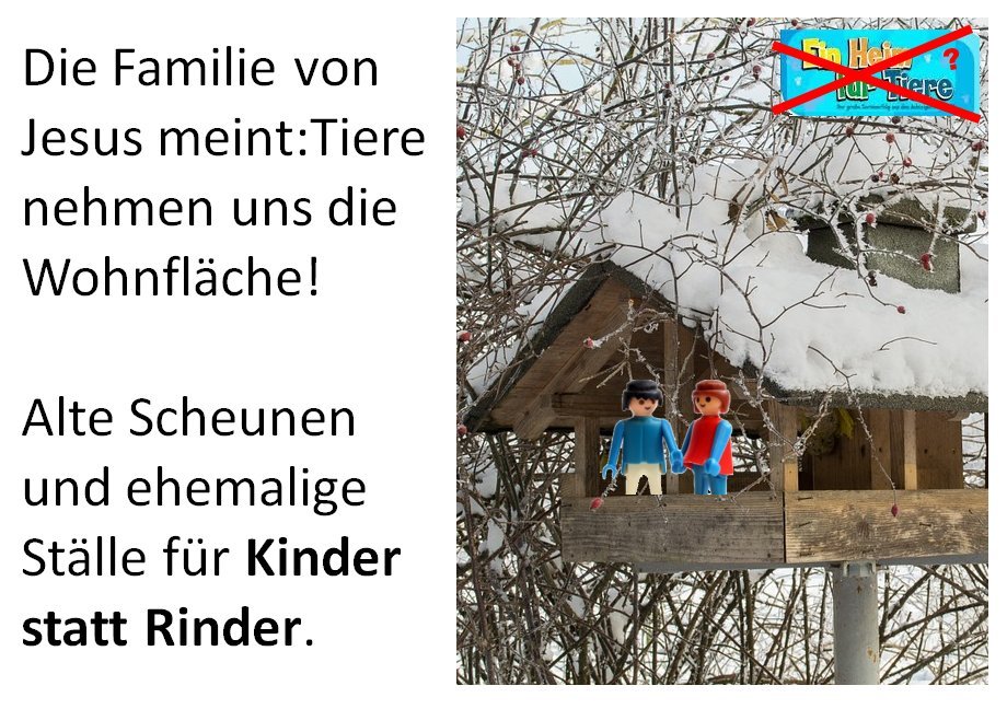 Die Familie von Jesus meint:Tiere nehmen uns Wohnfläche!Alte Scheunen und ehemalige Ställe für Kinder statt Rinder.