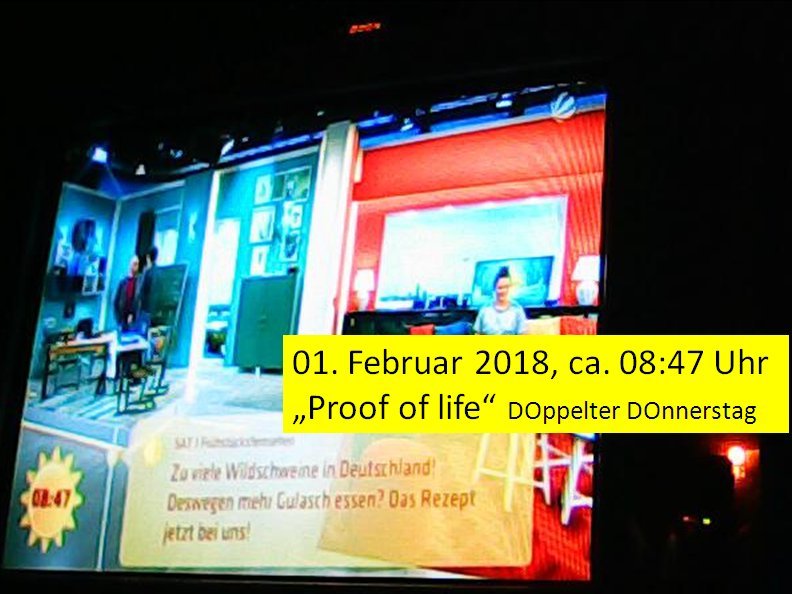 01.02.2018 07:50 01. Februar 2018, ca. 08:47 Uhr?Proof of life? DOppelter DOnnerstag [0] "201802010750-170373376783-0.jpg" [1] "201802010750-170373376783-1.jpg" [2] "201802010750-170373376783-2.jpg" |