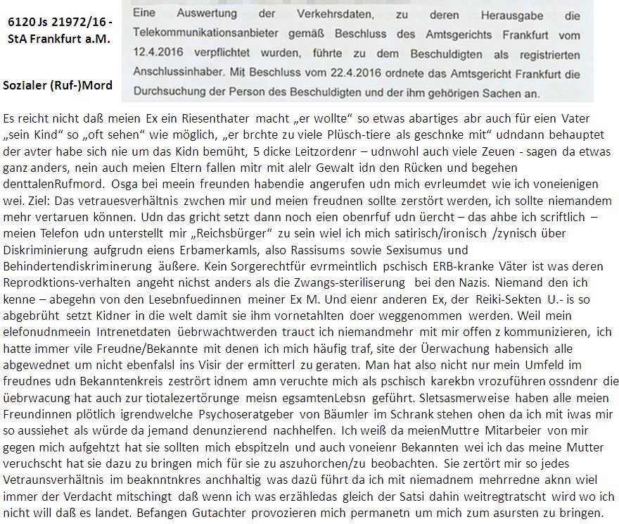 Es reicht nicht daß meien Ex ein Riesenthater macht ?er wollte? so etwas abartiges abr auch für eien Vater ?sein Kind? so ?oft sehen? wie möglich, ?er brchte zu viele Plüsch-tiere als geschnke mit? udndann behauptet der avter habe sich nie um das Kidn bemüht, 5 dicke Leitzordenr ? udnwohl auch viele Zeuen - sagen da etwas ganz anders, nein auch meien Eltern fallen mitr mit alelr Gewalt idn den Rücken und begehen denttalenRufmord. Osga bei meein freunden habendie angerufen udn mich evrleumdet wie ich voneienigen wei. Ziel: Das vetrauesverhältnis zwchen mir und meien freudnen sollte zerstört werden, ich sollte niemandem mehr vertaruen können. Udn das gricht setzt dann noch eien obenrfuf udn üercht ? das ahbe ich scriftlich ? meien Telefon udn unterstellt mir ?Reichsbürger? zu sein wiel ich mich satirisch/ironisch /zynisch über Diskriminierung aufgrudn eiens Erbamerkamls, also Rassisums sowie Sexisumus und Behindertendiskriminerung äußere. Kein Sorgerechtfür evrmeintlich pschisch ERB-kranke Väter ist was deren Reprodktions-verhalten angeht nichst anders als die Zwangs-steriliserung bei den Nazis. Niemand den ich kenne ? abegehn von den Lesebnfuedinnen meiner Ex M. Und eienr anderen Ex, der Reiki-Sekten U.- is so abgebrüht setzt Kidner in die welt damit sie ihm vornetahlten doer weggenommen werden. Weil mein elefonudnmeein Intrenetdaten üebrwachtwerden trauct ich niemandmehr mit mir offen z kommunizieren, ich hatte immer vile Freudne/Bekannte mit denen ich mich häufig traf, site der Üerwachung habensich alle abgewednet um nicht ebenfalsl ins Visir der ermitterl zu geraten. Man hat also nicht nur mein Umfeld im freudnes udn Bekanntenkreis zestrört idnem amn veruchte mich als pschisch karekbn vrozuführen ossndenr die üebrwacung hat auch zur tiotalezertörunge meisn egsamtenLebsn geführt. Sletsasmerweise haben alle meien Freundinnen plötlich igrendwelche Psychoseratgeber von Bäumler im Schrank stehen ohen da ich mit iwas mir so aussiehet als würde da jemand denunzierend nachhelfen. Ich weiß da meienMuttre Mitarbeier von mir gegen mich aufgehtzt hat sie sollten mich ebspitzeln und auch voneienr Bekannten wei ich das meine Mutter veruchscht hat sie dazu zu bringen mich für sie zu aszuhorchen/zu beobachten. Sie zertört mir so jedes Vetraunsverhältnis im beaknntnkres anchhaltig was dazü führt da ich mit niemadnem mehrredne aknn wiel immer der Verdacht mitschingt daß wenn ich was erzähledas gleich der Satsi dahin weitregtratscht wird wo ich nicht will daß es landet. Befangen Gutachter provozieren mich permanetn um mich zum asursten zu bringen.