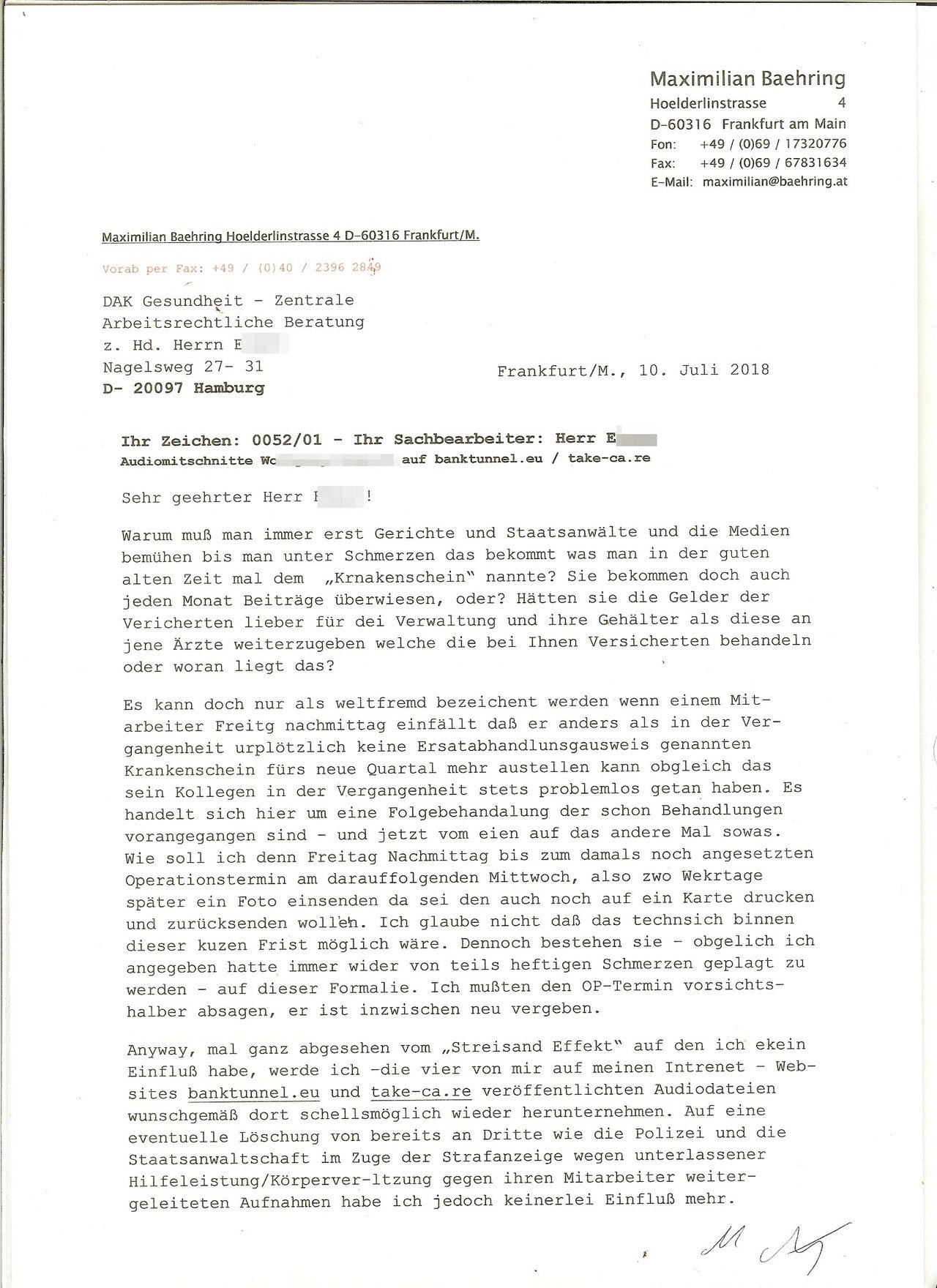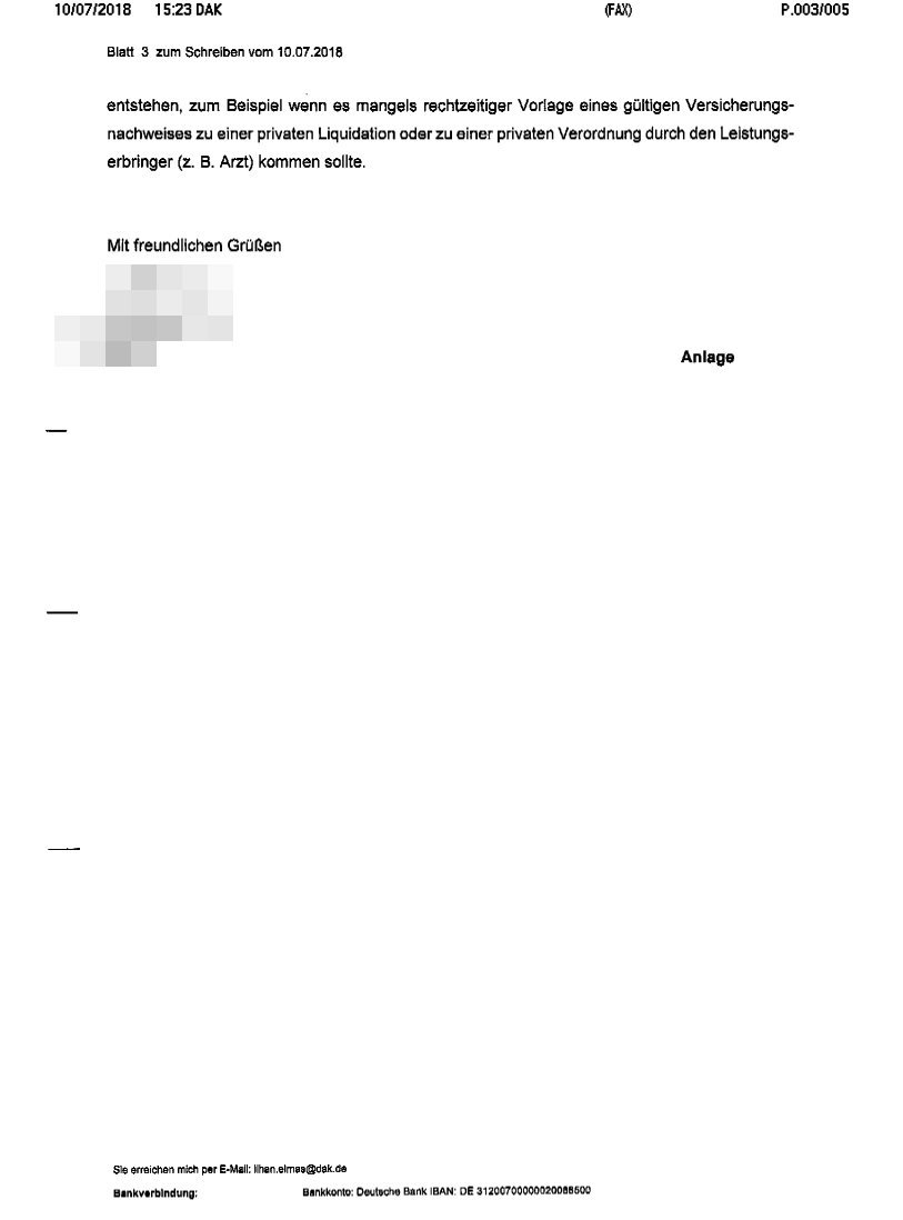 Den Schrifgtverkehr mit der Krankenkasse ?auch das 5 Seite Fax das ich von dieser erhalten habe - füge ich zu Ihrer Info bei.