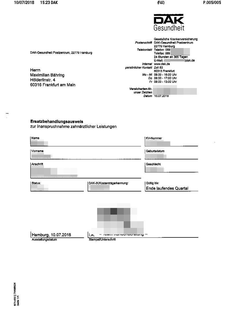 Den von mir gewünschten Krankenschein (neudeuscthe ?Ersatz-behandlungsausweis?) fürs neue Quartal den ch brauche damit