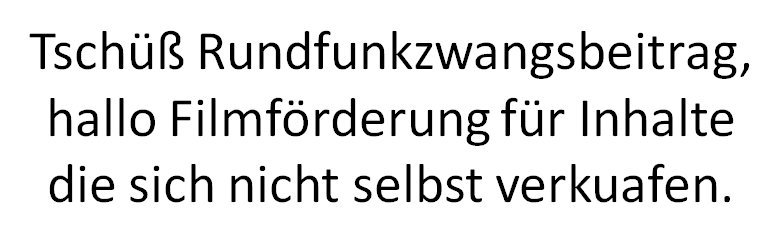 20.08.2018 01:37 Tschüß Rundfunkzwangsbeitrag, hallo Filmförderung für Inhaltedie sich nicht selbst verkuafen. [0] "201808200137-177197667058-0.jpg" |
