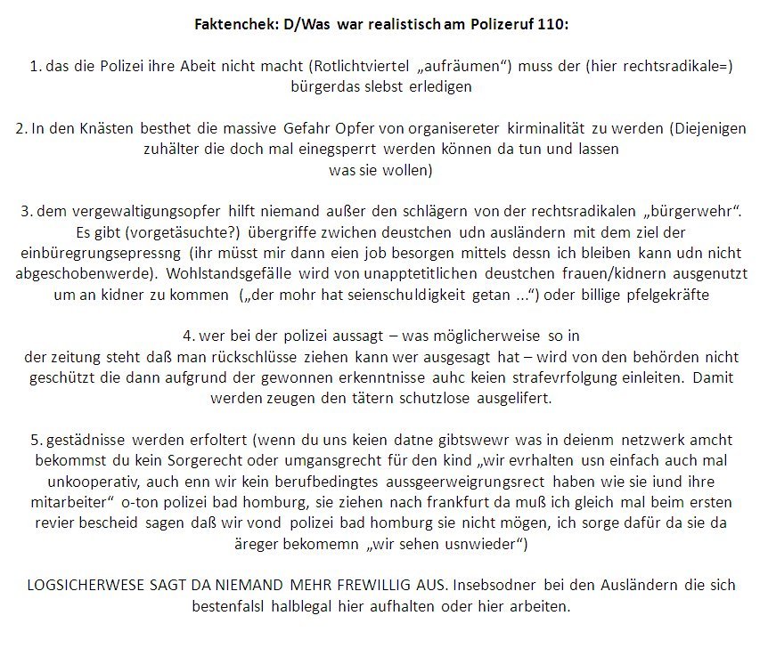 20.08.2018 11:27 https://www.daserste.de/unterhaltung/krimi/polizeiruf-110/sendung/das-gespenst-der-freiheit-100.html Faktenchek: D/Was war realistisch am Polizeruf 110: 1. das die Polizei ihre Abeit nicht macht (Rotlichtviertel ?aufräumen?) muss der (hier rechtsradikale=) bürgerdas slebst erledigen 2. In den Knästen besthet die massive Gefahr Opfer von organisereter kirminalität zu werden (Diejenigen zuhälter die doch mal einegsperrt werden können da tun und lassenwas sie wollen) 3. dem vergewaltigungsopfer hilft niemand außer den schlägern von der rechtsradikalen ?bürgerwehr?. Es gibt (vorgetäsuchte?) übergriffe zwichen deustchen udn ausländern mit dem ziel der einbüregrungsepressng (ihr müsst mir dann eien job besorgen mittels dessn ich bleiben kann udn nicht abgeschobenwerde). Wohlstandsgefälle wird von unapptetitlichen deustchen frauen/kidnern ausgenutzt um an kidner zu kommen (?der mohr hat seienschuldigkeit getan …?) oder billige pfelgekräfte 4. wer bei der polizei aussagt ? was möglicherweise so in der zeitung steht daß man rückschlüsse ziehen kann wer ausgesagt hat ? wird von den behörden nicht geschützt die dann aufgrund der gewonnen erkenntnisse auhc keien strafevrfolgung einleiten. Damit werden zeugen den tätern schutzlose ausgelifert. [0] "201808201127-177195388018-0.jpg" |