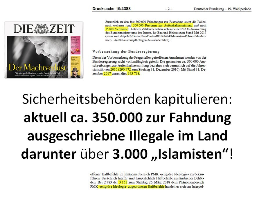 28.09.2018 10:32 Sicherheitsbehörden kapitulieren:aktuell ca. 350.000 zur Fahndung ausgeschriebne Illegale im Landdarunter über 3.000 ?Islamisten?! [0] "201809281032-178536513873-0.jpg" |