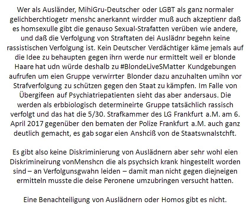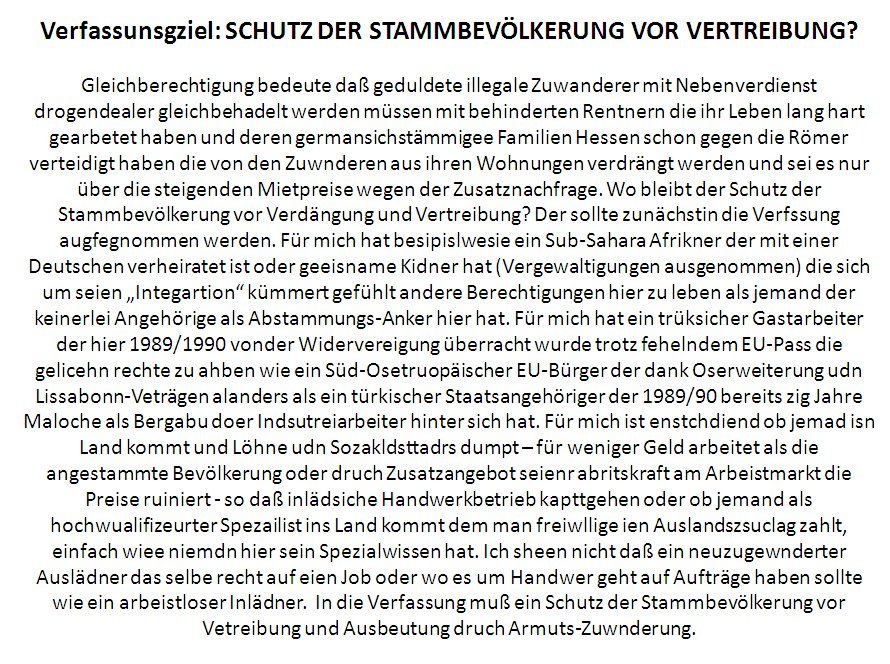 Gleichberechtigung bedeute daß geduldete illegale Zuwanderer mit Nebenverdienst drogendealer gleichbehadelt werden müssen mit behinderten Rentnern die ihr Leben lang hart gearbetet haben und deren germansichstämmigee Familien Hessen schon gegen die Römer verteidigt haben die von den Zuwnderen aus ihren Wohnungen verdrängt werden und sei es nur über die steigenden Mietpreise wegen der Zusatznachfrage. Wo bleibt der Schutz der Stammbevölkerung vor Verdängung und Vertreibung? Der sollte zunächstin die Verfssung augfegnommen werden. Für mich hat besipislwesie ein Sub-Sahara Afrikner der mit einer Deutschen verheiratet ist oder geeisname Kidner hat (Vergewaltigungen ausgenommen) die sich um seien ?Integartion? kümmert gefühlt andere Berechtigungen hier zu leben als jemand der keinerlei Angehörige als Abstammungs-Anker hier hat. Für mich hat ein trüksicher Gastarbeiter der hier 1989/1990 vonder Widervereigung überracht wurde trotz fehelndem EU-Pass die gelicehn rechte zu ahben wie ein Süd-Osetruopäischer EU-Bürger der dank Oserweiterung udn Lissabonn-Veträgen alanders als ein türkischer Staatsangehöriger der 1989/90 bereits zig Jahre Maloche als Bergabu doer Indsutreiarbeiter hinter sich hat. Für mich ist enstchdiend ob jemad isn Land kommt und Löhne udn Sozakldsttadrs dumpt ? für weniger Geld arbeitet als die angestammte Bevölkerung oder druch Zusatzangebot seienr abritskraft am Arbeistmarkt die Preise ruiniert - so daß inlädsiche Handwerkbetrieb kapttgehen oder ob jemand als hochwualifizeurter Spezailist ins Land kommt dem man freiwllige ien Auslandszsuclag zahlt, einfach wiee niemdn hier sein Spezialwissen hat. Ich sheen nicht daß ein neuzugewnderter Auslädner das selbe recht auf eien Job oder wo es um Handwer geht auf Aufträge haben sollte wie ein arbeistloser Inlädner. In die Verfassung muß ein Schutz der Stammbevölkerung vor Vetreibung und Ausbeutung druch Armuts-Zuwnderung.