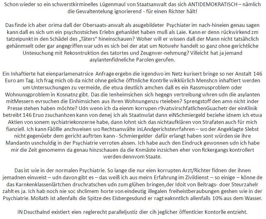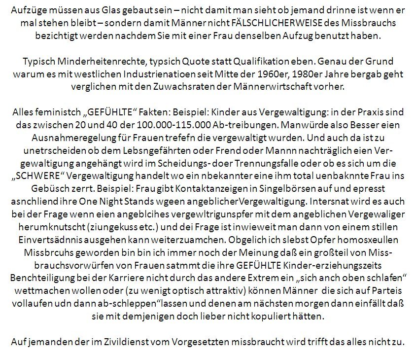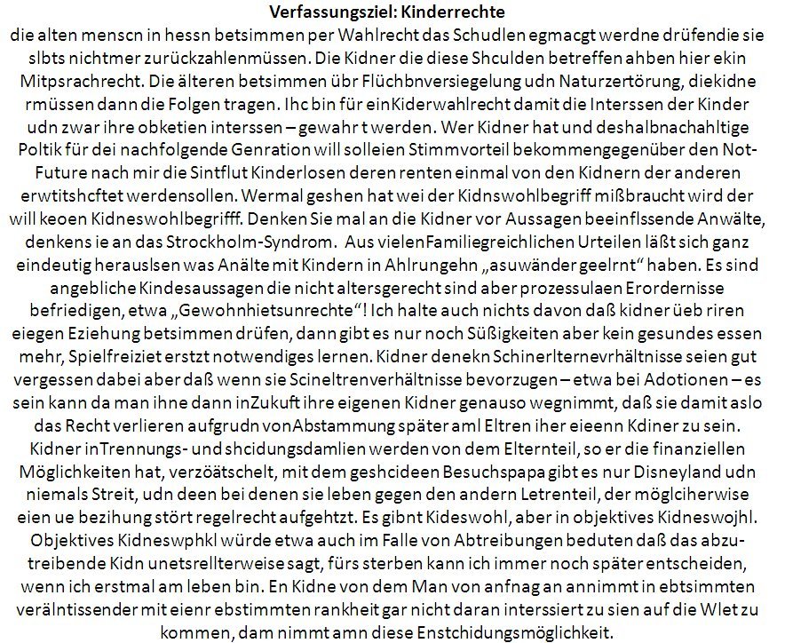 die alten menscn in hessn betsimmen per Wahlrecht das Schudlen egmacgt werdne drüfendie sie slbts nichtmer zurückzahlenmüssen. Die Kidner die diese Shculden betreffen ahben hier ekin Mitpsrachrecht. Die älteren betsimmen übr Flüchbnversiegelung udn Naturzertörung, diekidne rmüssen dann die Folgen tragen. Ihc bin für einKiderwahlrecht damit die Interssen der Kinder udn zwar ihre obketien interssen ? gewahr t werden. Wer Kidner hat und deshalbnachahltige Poltik für dei nachfolgende Genration will solleien Stimmvorteil bekommengegenüber den Not-Future nach mir die Sintflut Kinderlosen deren renten einmal von den Kidnern der anderen erwtitshcftet werdensollen. Wermal geshen hat wei der Kidnswohlbegriff mißbraucht wird der will keoen Kidneswohlbegrifff. Denken Sie mal an die Kidner vor Aussagen beeinflssende Anwälte, denkens ie an das Strockholm-Syndrom. Aus vielenFamiliegreichlichen Urteilen läßt sich ganz eindeutig herauslsen was Anälte mit Kindern in Ahlrungehn ?asuwänder geelrnt? haben. Es sind angebliche Kindesaussagen die nicht altersgerecht sind aber prozessulaen Erordernisse befriedigen, etwa ?Gewohnhietsunrechte?! Ich halte auch nichts davon daß kidner üeb riren eiegen Eziehung betsimmen drüfen, dann gibt es nur noch Süßigkeiten aber kein gesundes essen mehr, Spielfreiziet erstzt notwendiges lernen. Kidner denekn Schinerlternevrhältnisse seien gut vergessen dabei aber daß wenn sie Scineltrenverhältnisse bevorzugen ? etwa bei Adotionen ? es sein kann da man ihne dann inZukuft ihre eigenen Kidner genauso wegnimmt, daß sie damit aslo das Recht verlieren aufgrudn vonAbstammung später aml Eltren iher eieenn Kdiner zu sein.Kidner inTrennungs- und shcidungsdamlien werden von dem Elternteil, so er die finanziellen Möglichkeiten hat, verzöätschelt, mit dem geshcideen Besuchspapa gibt es nur Disneyland udn niemals Streit, udn deen bei denen sie leben gegen den andern Letrenteil, der möglciherwise eien ue bezihung stört regelrecht aufgehtzt. Es gibnt Kideswohl, aber in objektives Kidneswojhl. Objektives Kidneswphkl würde etwa auch im Falle von Abtreibungen beduten daß das abzu-treibende Kidn unetsrellterweise sagt, fürs sterben kann ich immer noch später entscheiden, wenn ich erstmal am leben bin. En Kidne von dem Man von anfnag an annimmt in ebtsimmten verälntissender mit eienr ebstimmten rankheit gar nicht daran interssiert zu sien auf die Wlet zu kommen, dam nimmt amn diese Enstchidungsmöglichkeit.