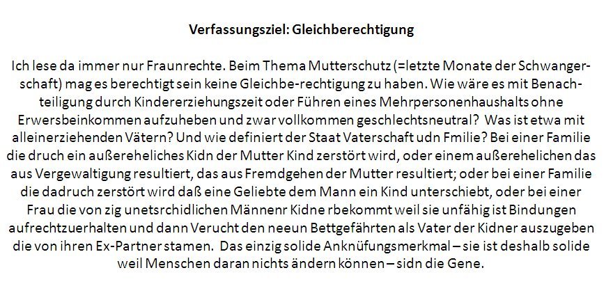 Ich lese da immer nur Fraunrechte. Beim Thema Mutterschutz (=letzte Monate der Schwanger-schaft) mag es berechtigt sein keine Gleichbe-rechtigung zu haben. Wie wäre es mit Benach-teiligung durch Kindererziehungszeit oder Führen eines Mehrpersonenhaushalts ohne Erwersbeinkommen aufzuheben und zwar vollkommen geschlechtsneutral? Was ist etwa mit alleinerziehenden Vätern? Und wie definiert der Staat Vaterschaft udn Fmilie? Bei einer Familie die druch ein außereheliches Kidn der Mutter Kind zerstört wird, oder einem außerehelichen das aus Vergewaltigung resultiert, das aus Fremdgehen der Mutter resultiert; oder bei einer Familie die dadruch zerstört wird daß eine Geliebte dem Mann ein Kind unterschiebt, oder bei einer Frau die von zig unetsrchidlichen Männenr Kidne rbekommt weil sie unfähig ist Bindungen aufrechtzuerhalten und dann Verucht den neeun Bettgefährten als Vater der Kidner auszugebendie von ihren Ex-Partner stamen. Das einzig solide Anknüfungsmerkmal ? sie ist deshalb solide weil Menschen daran nichts ändern können ? sidn die Gene.