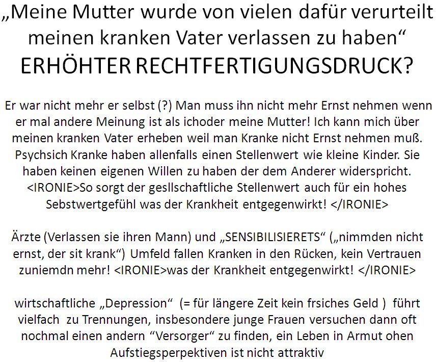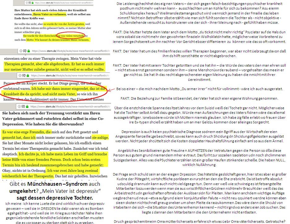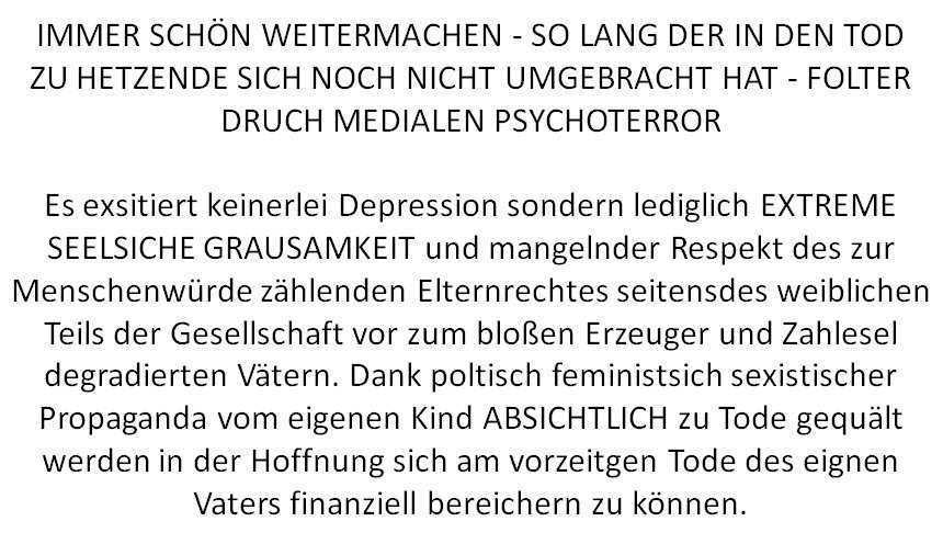 Es exsitiert keinerlei Depression sondern lediglich EXTREME SEELSICHE GRAUSAMKEIT und mangelnder Respekt des zur Menschenwürde zählenden Elternrechtes seitensdes weiblichen Teils der Gesellschaft vor zum bloßen Erzeuger und Zahlesel degradierten Vätern. Dank poltisch feministsich sexistischer Propaganda vom eigenen Kind ABSICHTLICH zu Tode gequält werden in der Hoffnung sich am vorzeitgen Tode des eignen Vaters finanziell bereichern zu können.