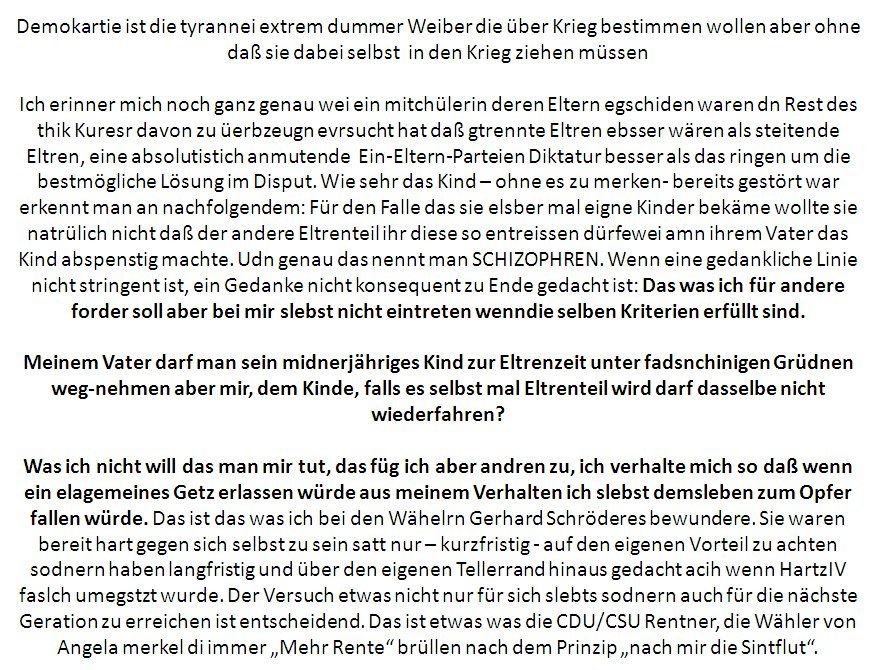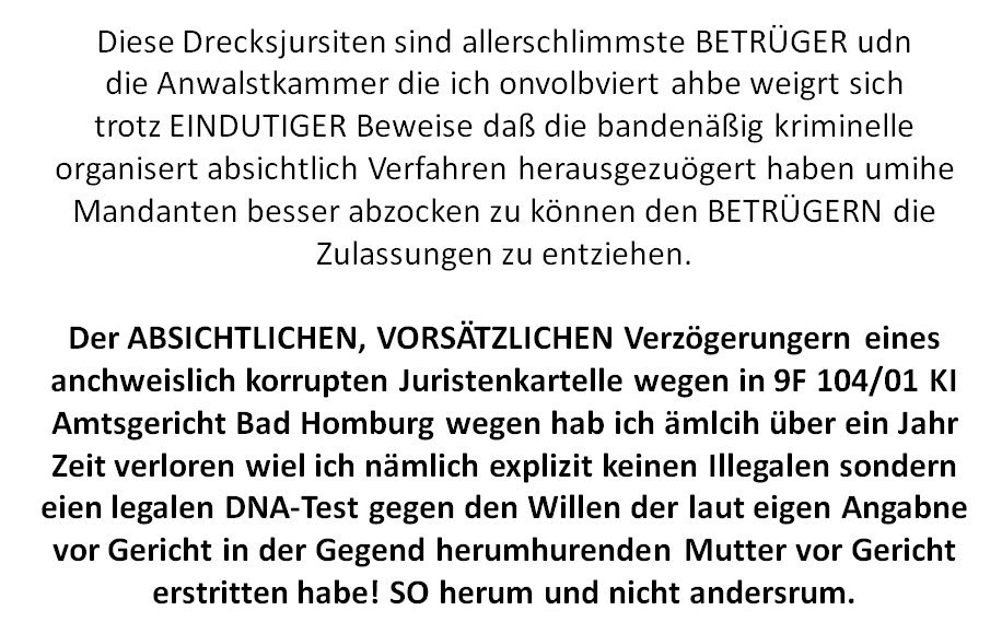 Der ABSICHTLICHEN, VORSÄTZLICHEN Verzögerungern eines anchweislich korrupten Juristenkartelle wegen in 9F 104/01 KI Amtsgericht Bad Homburg wegen hab ich ämlcih über ein Jahr Zeit verloren wiel ich nämlich explizit keinen Illegalen sondern eien legalen DNA-Test gegen den Willen der laut eigen Angabne vor Gericht in der Gegend herumhurenden Mutter vor Gericht erstritten habe! SO herum und nicht andersrum.