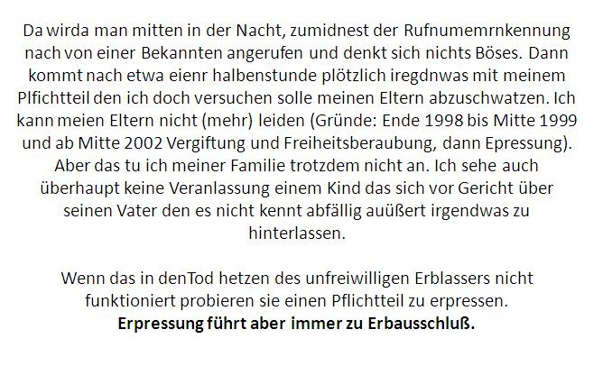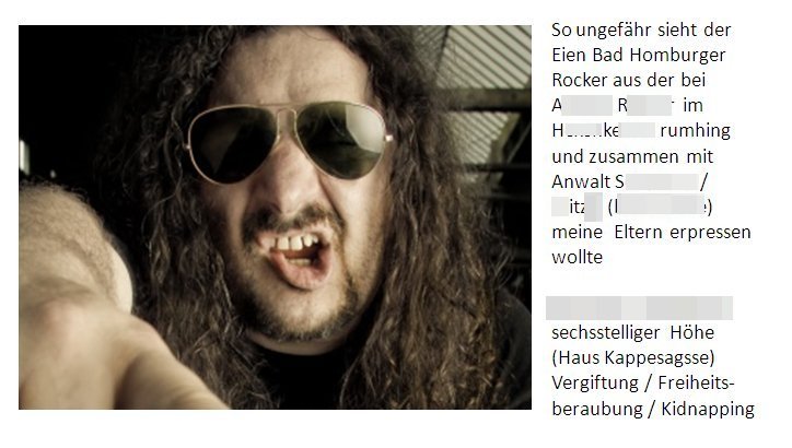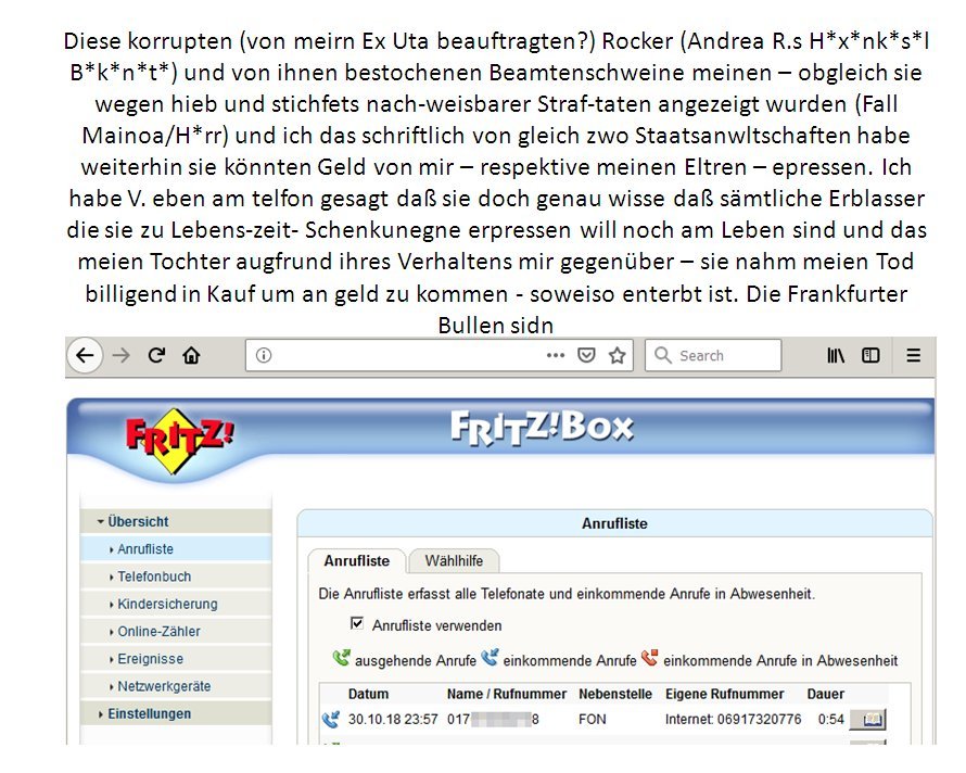 Psychoterror durch Rocker (Anwalt Schramm Anwlat Weber udn Anwalt frITZel) die sich das zwote Haus meiner Eltren unter den Nagel reissen wollten. Das ist exakt die GEschichte der Alten fau aus dem Ahlweg nur eben daß diesmal eine Straftat besteht weil die Situation heir ganz absichtlich nachgespielt wird.