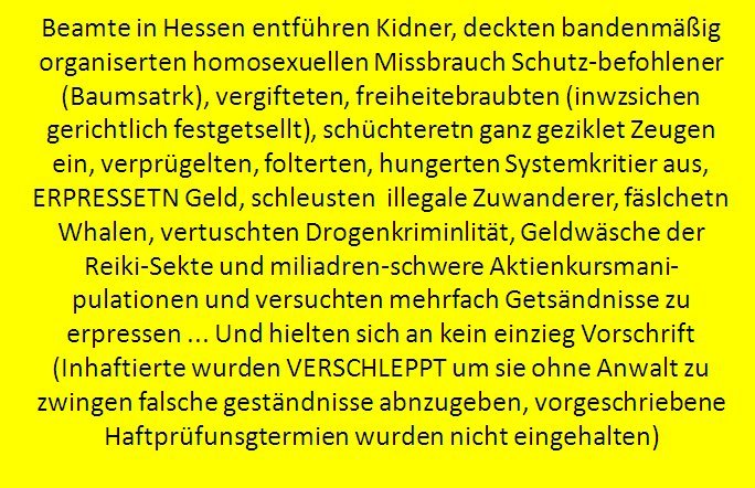 Beamte in Hessen entführen Kidner, deckten bandenmäßig organiserten homosexuellen Missbrauch Schutz-befohlener (Baumsatrk), vergifteten, freiheitebraubten (inwzsichen gerichtlich festgetsellt), schüchteretn ganz geziklet Zeugen ein, verprügelten, folterten, hungerten Systemkritier aus, ERPRESSETN Geld, schleusten illegale Zuwanderer, fäslchetn Whalen, vertuschten Drogenkriminlität, Geldwäsche der Reiki-Sekte und miliadren-schwere Aktienkursmani-pulationen und versuchten mehrfach Getsändnisse zu erpressen … Und hielten sich an kein einzieg Vorschrift (Inhaftierte wurden VERSCHLEPPT um sie ohne Anwalt zu zwingen falsche geständnisse abnzugeben, vorgeschriebene Haftprüfunsgtermien wurden nicht eingehalten)