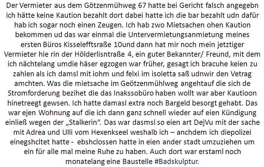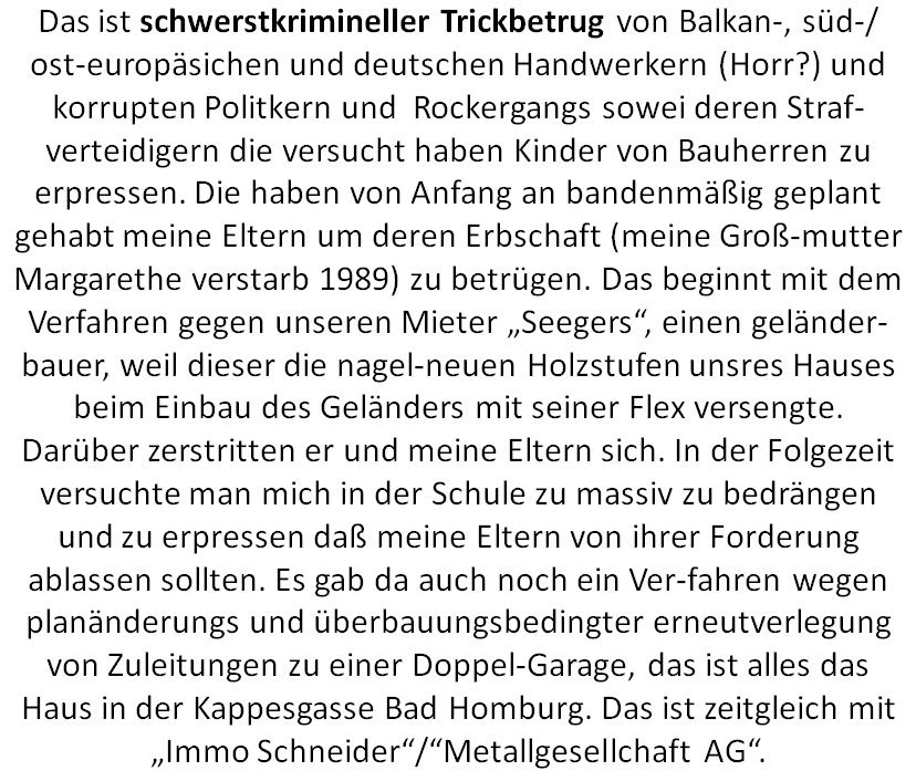 udn ich bin seit über 15 ahren daran krnakenkassen dafür verantwortlich zu amchen wenn für ds Quälen von Patienten durch Behandlung gegen deren Willen betrügerich abge-rechnet wird wie etwa durch die Klinik Dr. Baumstark in Bad Homburg v.d.Höhe wo mir das erstamlig uhnetrkam. Seitdem bin ich Opfer einer ganz gezielten verleumdungs udn Rache-kampgne bei der ich bedroht, zusammen-geschlagen, mehrfach der Freiheit beraubt und das illegalerweise wie man anhand der letztendlich erstrittenen Entschädigungen sieht - man hat mir mein Kind entführt und versucht mich im Verfahren gegen den Hausmeister Peter Hett der Klinik Dr. Bausmatrk der mich sexuell missbruacht hatte psychiatrisch mundtot zu machen, man hat versucht zu verhindern daß ich in Sachen Aktienkurs-manipulationen Metallgesellchaft AG aussage, in Sachen Barschel, in Sachen Herrhausen, in Sachen Immobilen Schneider (“Peanuts”). Und in Sachen medialer Hetz-Kampagen gegen zahlreiche Politker.
