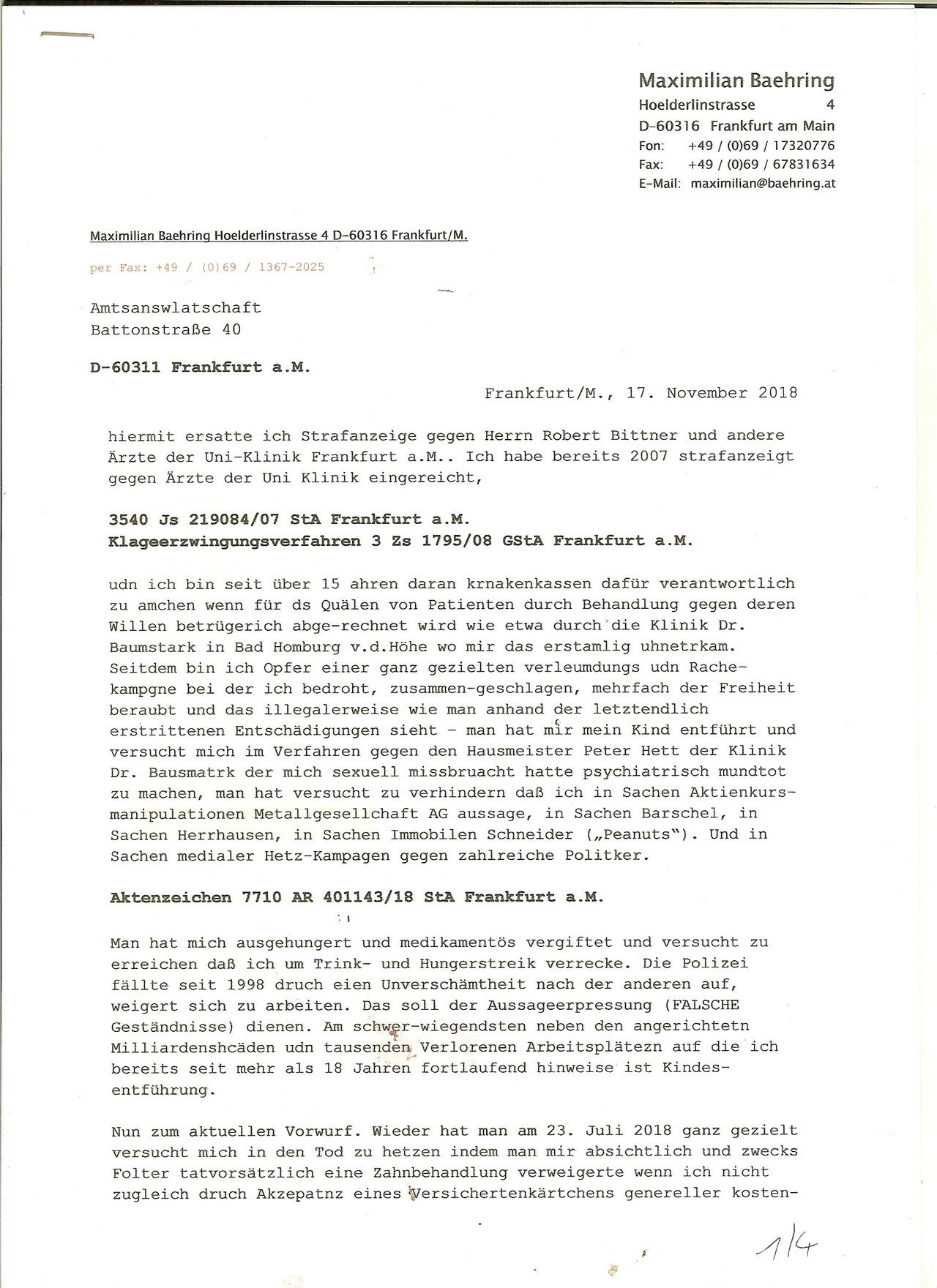hiermit ersatte ich Strafanzeige gegen Herrn Robert Bittner und andere Ärzte der Uni-Klinik Frankfurt a.M.. Ich habe bereits 2007 strafanzeigt gegen Ärzte der Uni Klinik eingereicht,