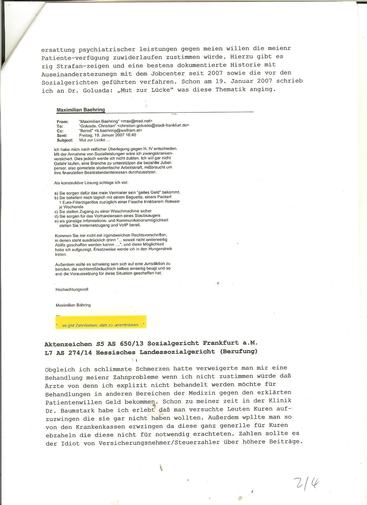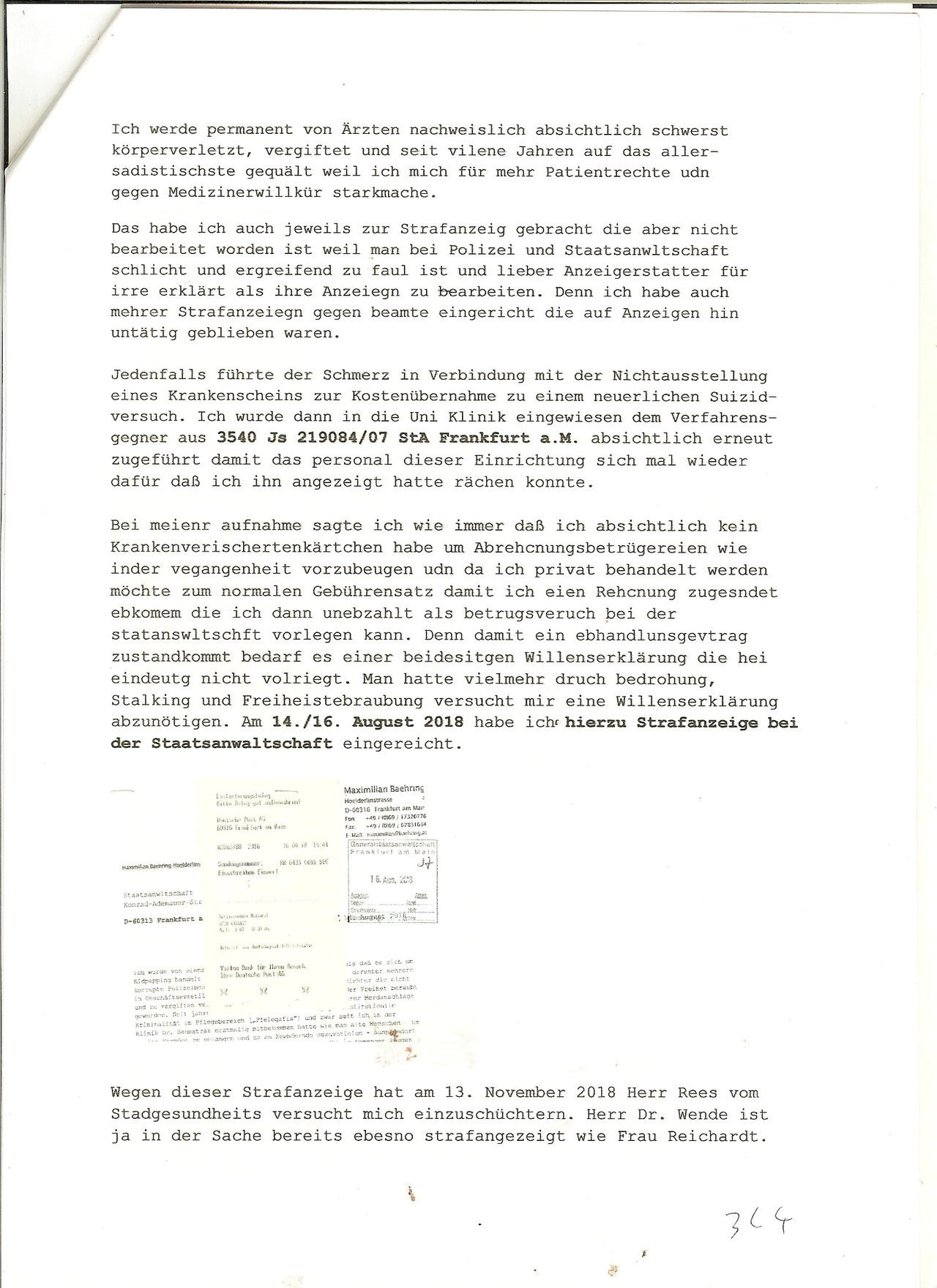 Jedenfalls führte der Schmerz in Verbindung mit der Nichtausstellung eines Krankenscheins zur Kostenübernahme zu einem neuerlichen Suizid-versuch. Ich wurde dann in die Uni Klinik eingewiesen dem Verfahrens-gegner aus 3540 Js 219084/07 StA Frankfurt a.M. absichtlich erneut zugeführt damit das personal dieser Einrichtung sich mal wieder dafür daß ich ihn angezeigt hatte rächen konnte.