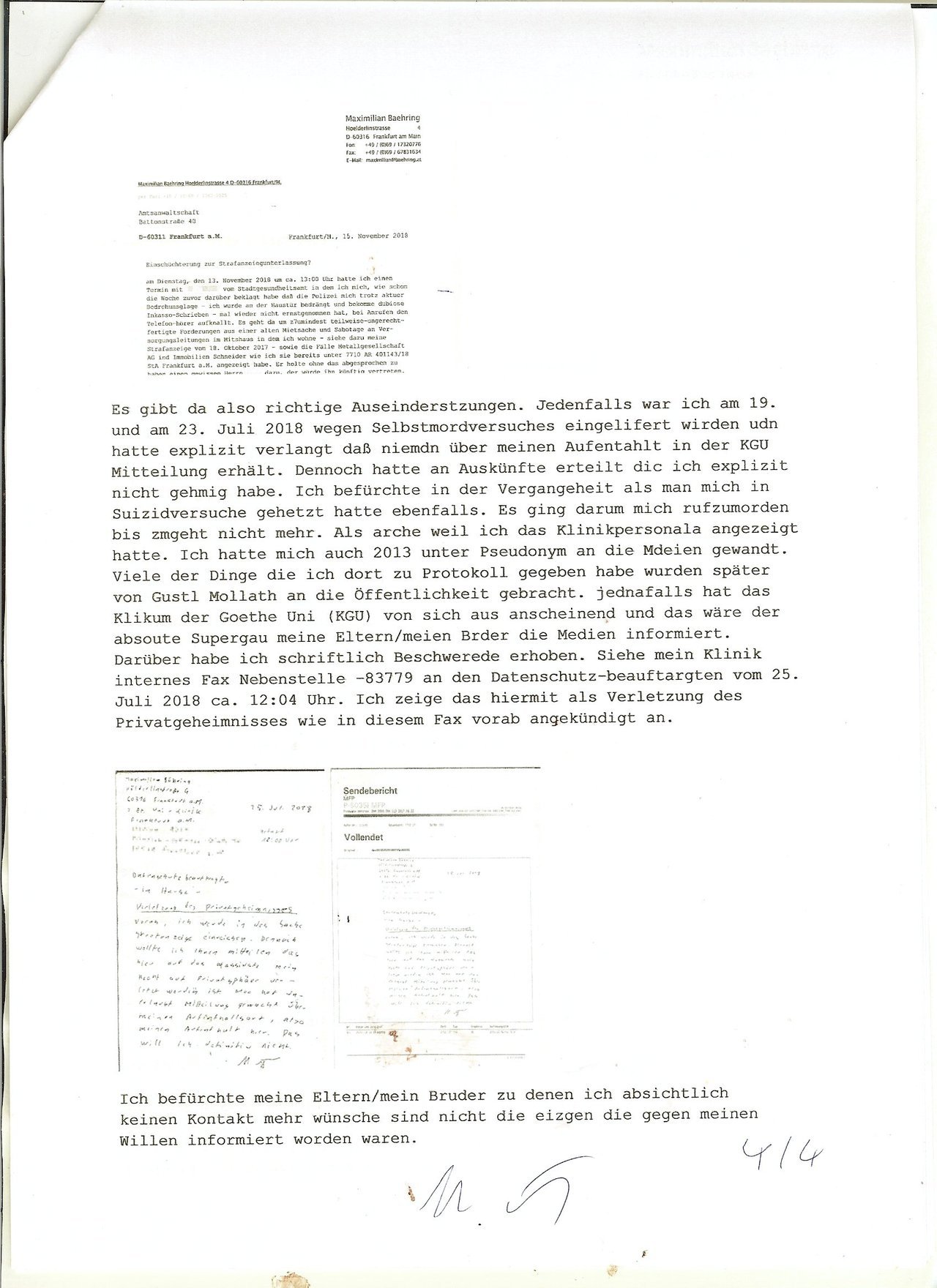Es gibt da also richtige Auseinderstzungen. Jedenfalls war ich am 19. und am 23. Juli 2018 wegen Selbstmordversuches eingelifert wirden udn hatte explizit verlangt daß niemdn über meinen Aufentahlt in der KGU Mitteilung erhält. Dennoch hatte an Auskünfte erteilt dic ich explizit nicht gehmig habe. Ich befürchte in der Vergangeheit als man mich in Suizidversuche gehetzt hatte ebenfalls. Es ging darum mich rufzumorden bis zmgeht nicht mehr. Als arche weil ich das Klinikpersonala angezeigt hatte. Ich hatte mich auch 2013 unter Pseudonym an die Mdeien gewandt. Viele der Dinge die ich dort zu Protokoll gegeben habe wurden später von Gustl Mollath an die Öffentlichkeit gebracht. jednafalls hat das Klikum der Goethe Uni (KGU) von sich aus anscheinend und das wäre der absoute Supergau meine Eltern/meien Brder die Medien informiert. Darüber habe ich schriftlich Beschwerede erhoben. Siehe mein Klinik internes Fax Nebenstelle -83779 an den Datenschutz-beauftargten vom 25. Juli 2018 ca. 12:04 Uhr. Ich zeige das hiermit als Verletzung des Privatgeheimnisses wie in diesem Fax vorab angekündigt an.